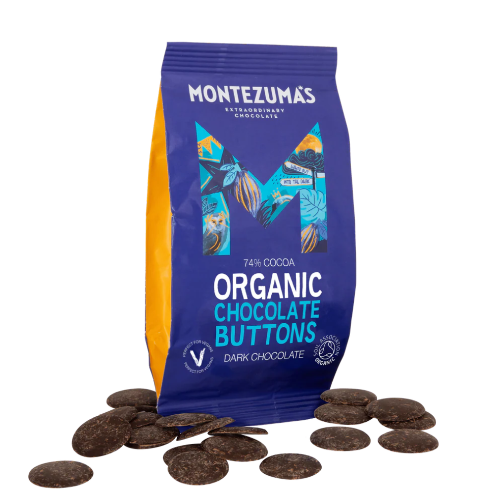 Montezuma’s Organic 74% Dark Chocolate Giant Buttons are a playful twist on their classic dark chocolate bars. Made with organic cocoa mass, cocoa butter, cane sugar, and natural vanilla, these chunky buttons deliver all the richness of dark chocolate in a moreish bite sized form.