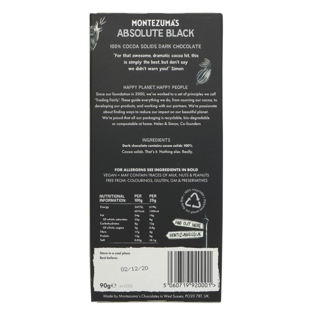 Montezuma's Absolute Black with Almonds is chocolate at its boldest. Made with 100% cocoa dark chocolate and balanced with crunchy almonds, it offers a naturally creamy, nutty bite that softens the intensity of pure cocoa.
