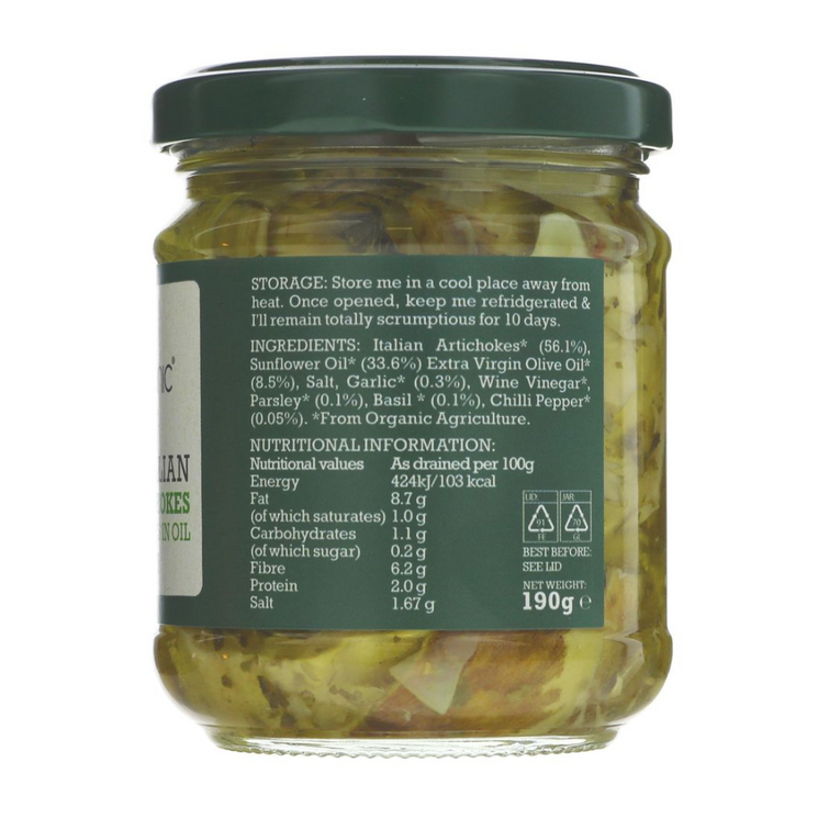 Crafted in Italy using organically grown artichokes, this antipasti is prepared with care to preserve its natural texture and taste. The artichokes are lightly grilled to bring out their earthy sweetness and layered with aromatic herbs and a gentle touch of chilli. Preserved in sunflower oil and extra virgin olive oil, this delicious blend captures the warmth of Mediterranean cuisine and adds a gourmet flourish to any dish.