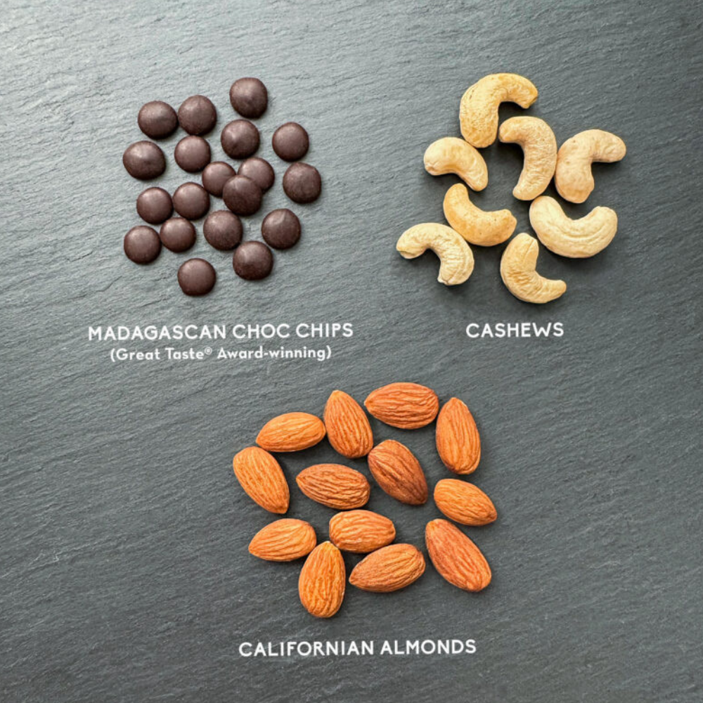 Almonds (43%), cashews (38%), 81% cocoa Madagascan chocolate chips (19%) (Madagascan cocoa mass, coconut sugar, cocoa butter, vanilla extract).