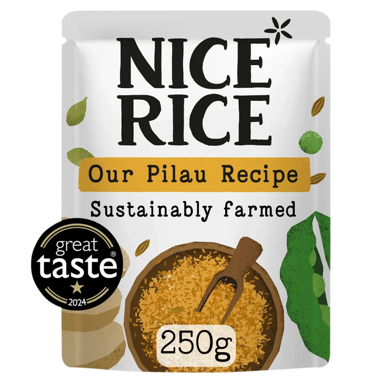 Nice Rice Pilau Basmati Rice brings together fragrant extra long grain basmati rice with a traditional blend of aromatic spices inspired by a family recipe from Haryana, India. The rice is naturally aged, helping the grains stay beautifully separate while absorbing the warm notes of turmeric, cumin, fennel and coriander. Ready in just two minutes, it’s a convenient way to enjoy a flavourful rice dish without long preparation. With potatoes, peas and caramelised onions woven through the rice, it makes a delicious accompaniment to curries, grilled vegetables or quick weeknight meals.