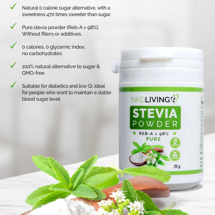 NKD Living Pure Stevia Powder is a natural, high-intensity sweetener made from the purest part of the Stevia leaf Rebaudioside A at 98% purity. With a sweetness equivalent to 470 times that of sugar, just a tiny amount adds the perfect touch of sweetness to drinks, bakes, and recipes without the calories or carbohydrates.