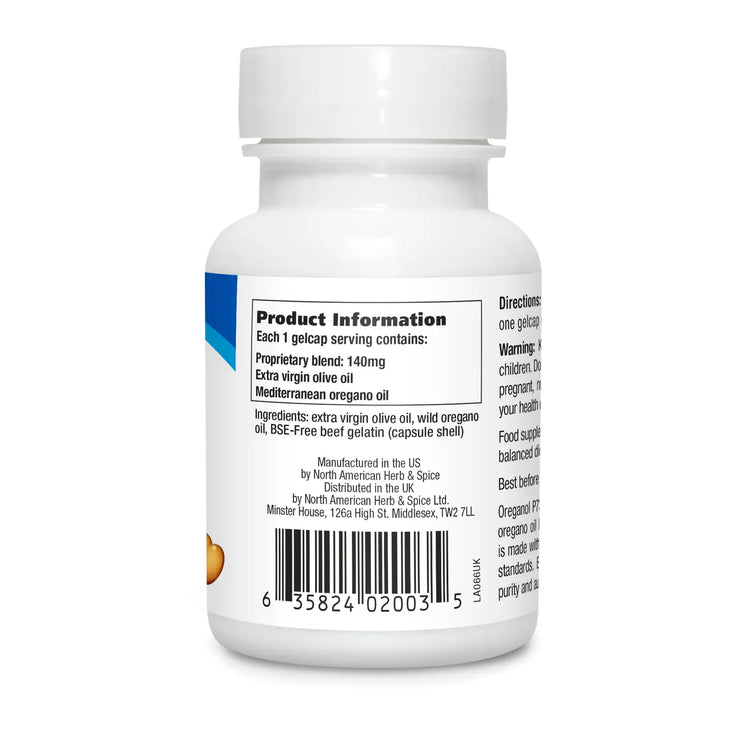 Ingredients: Olive oil, Wild Mediterranean Oregano Oil P73, beef gelatin (capsule material).