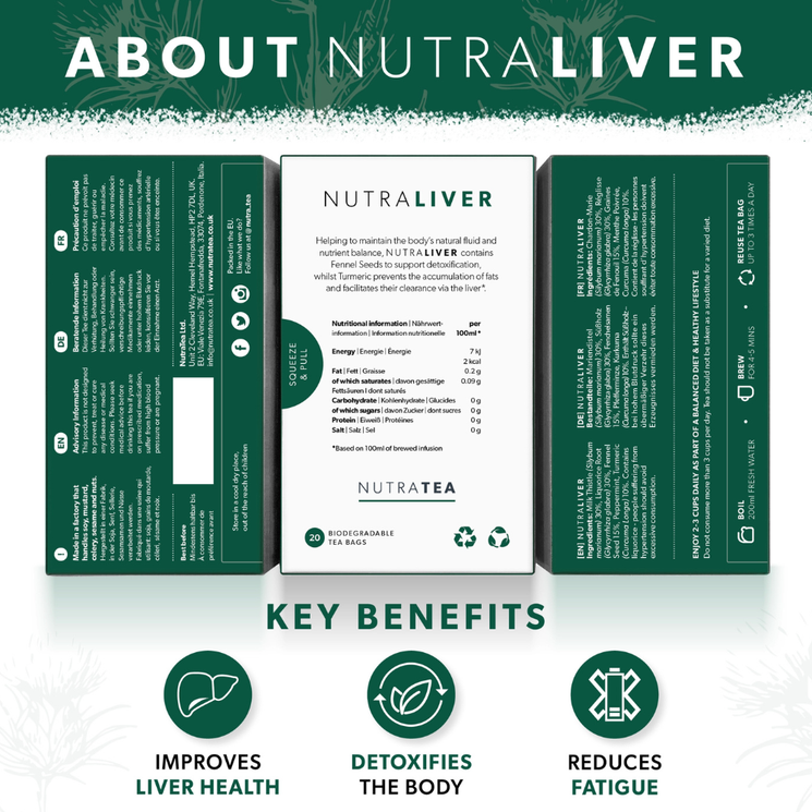 Crafted from 100% natural herbs with no flavourings or oils, NutraTea’s Liver Herbal Tea is pure wellness in a cup. Designed to protect the liver, aid digestion, and promote detoxification, this eco friendly blend supports a holistic, health conscious lifestyle while delivering real functional benefits.
