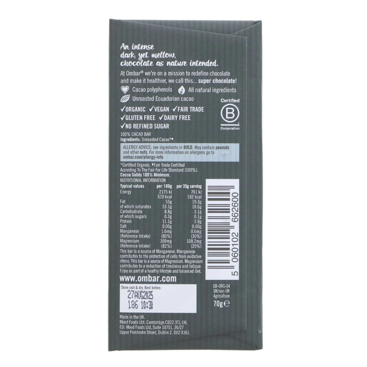 Ombar 100% Organic Chocolate is dark chocolate in its purest form just cacao, as nature intended. Made from premium Ecuadorian cacao and crafted in small batches, this bar delivers a rich yet balanced flavour with natural complexity and zero bitterness.
