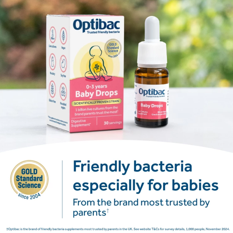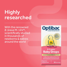 Optibac Baby Drops are specially formulated to help support your baby’s developing gut flora and immune system from day one. Containing the world renowned probiotic strain Bifidobacterium breve M-16V®, these drops provide 1 billion live cultures per serving proven in thousands of infants to safely reach the gut and help maintain healthy levels of beneficial bacteria.
