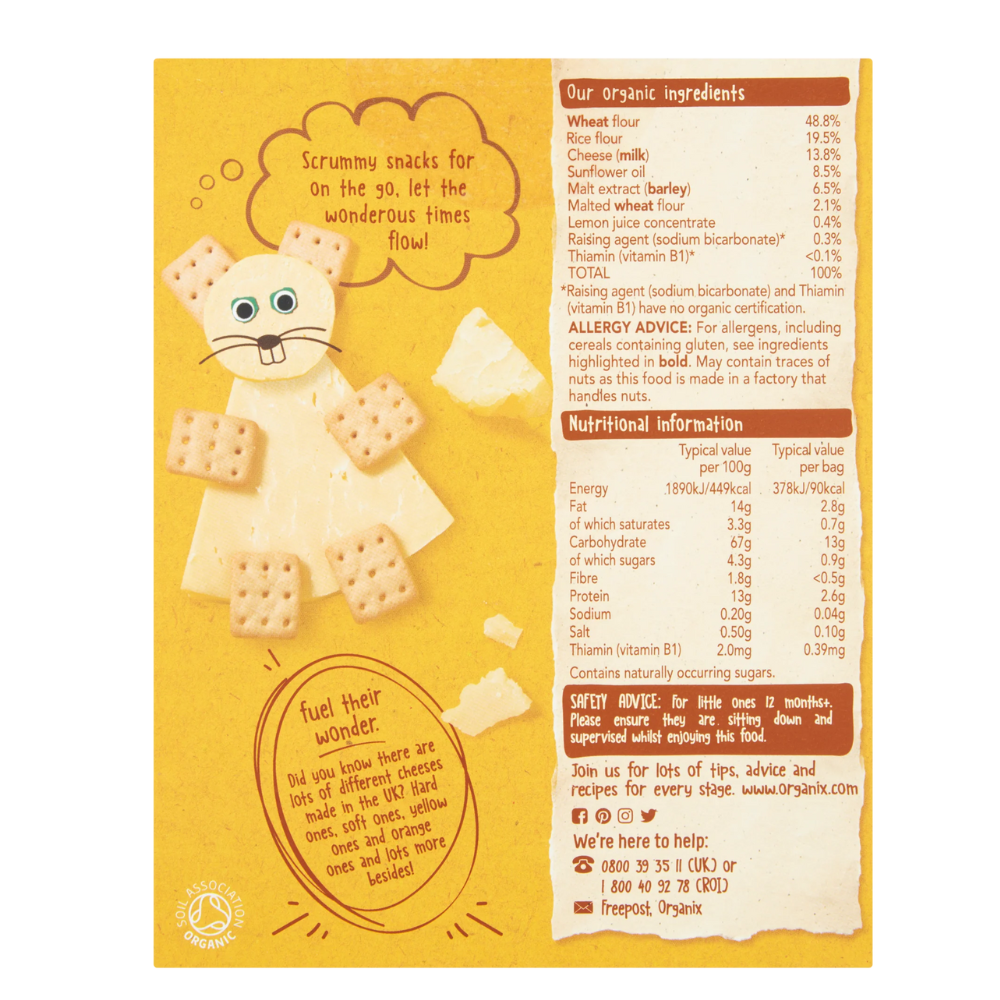 Organix Mini Cheese Crackers are a scrummy, crunchy snack made especially for little ones learning to explore bigger flavours. Made with organic wholegrain wheat, real organic cheese and simple ingredients you can trust, they offer a savoury, satisfying bite without any artificial additives.