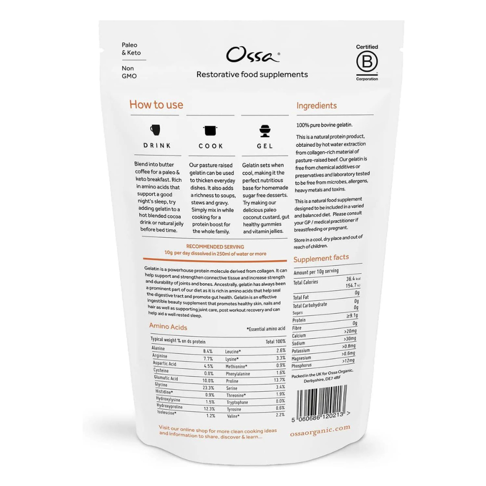 Ossa Pasture Raised Gelatin is a pure, nutrient dense protein source made from cattle raised ethically on pasture in the UK. Naturally rich in amino acids and collagen, it supports healthy hair, skin, nails, joints and overall wellbeing. This versatile gelatin gels easily and can be stirred into hot liquids, used as a base for homemade vitamin gummies, or added to stews and gravies for extra nourishment.