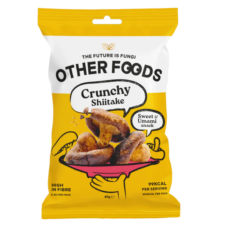 Other Foods Crunchy Shiitake Mushroom Chips are a delicious, plant-based snack crafted from whole shiitake mushrooms. Cooked under vacuum at lower temperatures, they retain their natural flavour and nutrients while using less oil than standard deep frying methods.