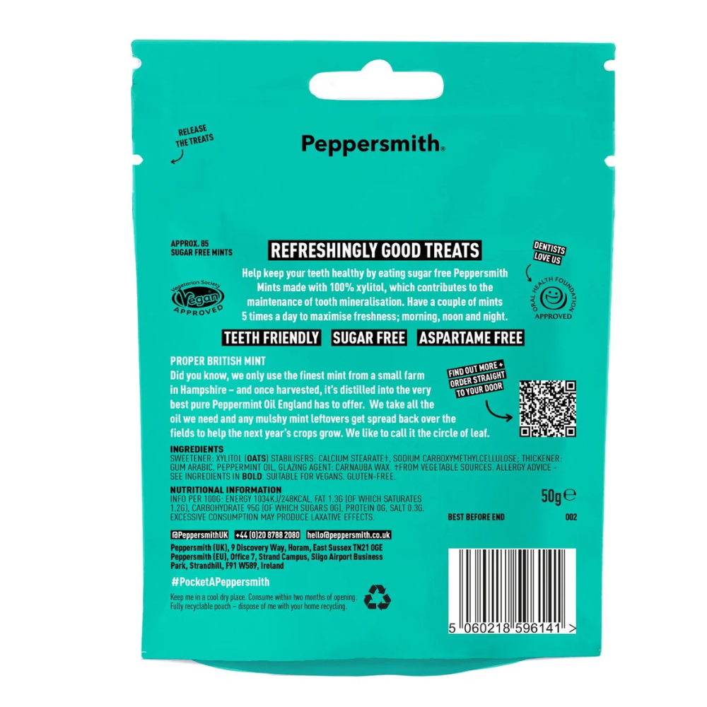 Peppersmith Premium Peppermint Mints deliver a bold, refreshing burst of proper British mint, grown and harvested in Hampshire for exceptional flavour. Each resealable Mighty Pouch contains around 85 mints perfect for long journeys, travel bags, shared moments or keeping at your desk for instant freshness.