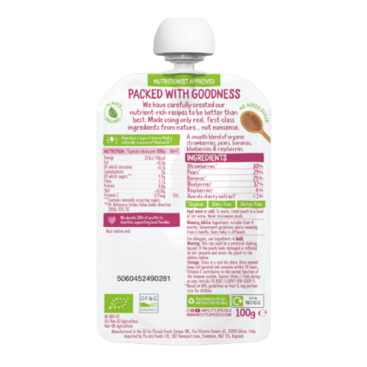This vibrant berry blend is packed with the natural sweetness of strawberries, pears, blueberries and banana, plus a splash of acerola cherry for a boost of vitamin C. It's a smooth, fruity pouch that delivers both flavour and nutrition in one easy squeeze ideal for babies, toddlers or on-the-go snacking. No fuss, no additives – just honest organic fruit.