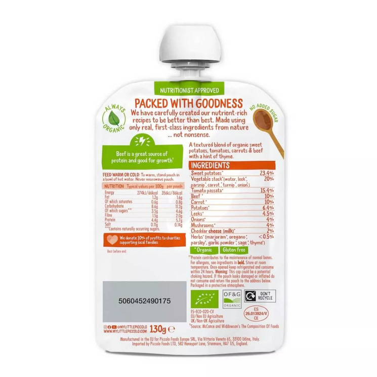 Organic Sweet Potatoes (23.4%), Organic Vegetable Stock (15%), Organic Tomato Passata (15.4%), Organic Carrots (10%), Organic Beef (10%), Organic Potatoes (7.5%), Organic Leeks (4.5%), Organic Onions (4%), Organic Mushrooms (4%), Organic Cheddar Cheese (2%), Organic Herbs (Parsley, Sage, Marjoram, Oregano, Thyme) (<0.1%), Organic Garlic (<0.1%).