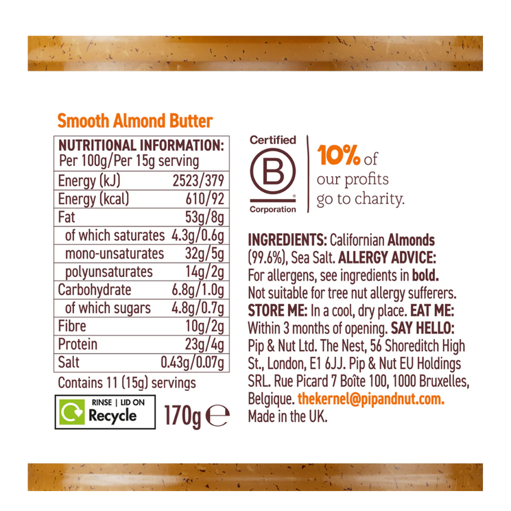 Pip & Nut Smooth Almond Butter is crafted from 99.6% premium Californian almonds, selected from only four varieties out of fifty for their exceptional flavour. Stone milked into a silky, pourable butter, it delivers earthy, naturally sweet notes and a smooth finish. With no palm oil or added sugar, it’s a wholesome spread packed with natural nutrients, perfect for toast, porridge, smoothies or spoon straight from the jar moments.