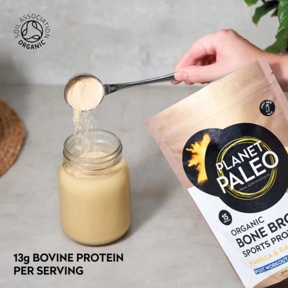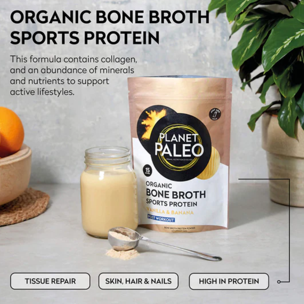 Planet Paleo’s Vanilla & Banana Bone Broth Protein brings together grass fed bone broth with organic fruit and spices to create a naturally sweet, nourishing blend. Slowly simmered and gently dehydrated, it retains valuable collagen, amino acids and minerals that support everyday wellbeing. With a smooth flavour and excellent solubility, it’s ideal for shakes, smoothies and post workout recovery.