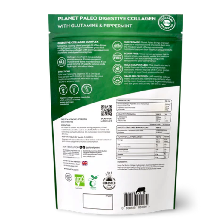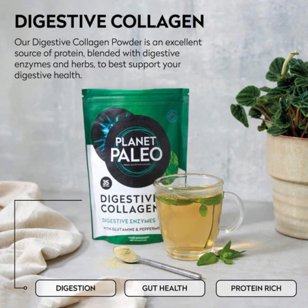 Planet Paleo Digestive Collagen is a soothing and restorative blend designed to support digestive wellness and overall gut health. It combines grass-fed collagen peptides a highly bioavailable protein source with digestive enzymes, beneficial bacteria, and traditional herbs known to calm and support the digestive system.