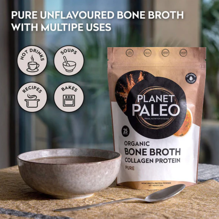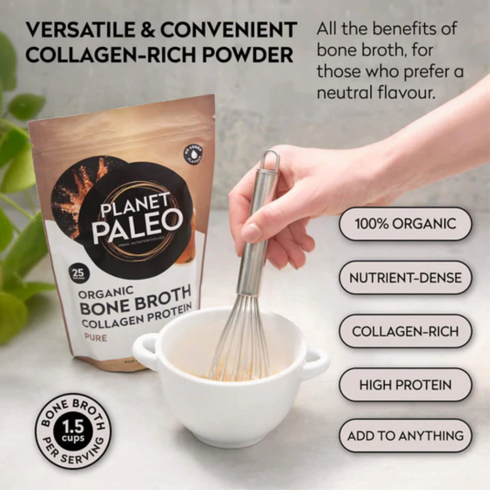 Planet Paleo prioritises ethically sourced, grass fed ingredients and traditional preparation methods, ensuring a clean and naturally nutrient dense product. This simple, single ingredient bone broth is free from fillers, flavourings and anti caking agents perfect for anyone seeking high quality collagen support that aligns with sustainable, whole food principles. Each serving delivers a powerful dose of protein and amino acids, supporting gut health, immunity and daily wellbeing.