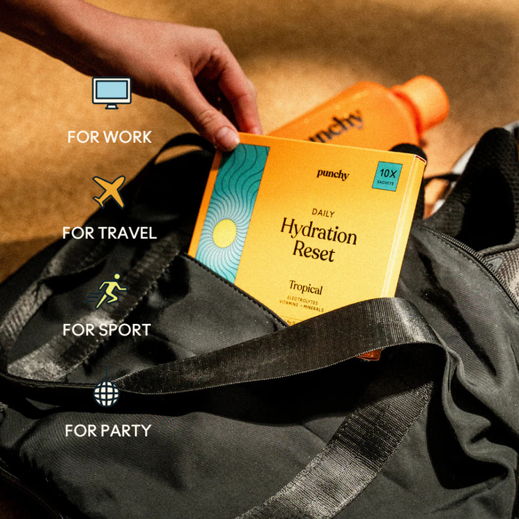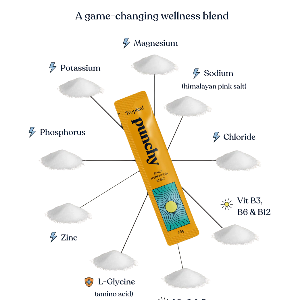 Punchy’s Daily Hydration Reset Sachets are designed to help you stay hydrated, energised, and replenished every day. Each tropical-flavoured sachet blends essential electrolytes with vitamins B, C, and D to support energy metabolism and reduce tiredness. Formulated with Himalayan pink salt and naturally sourced minerals, it helps maintain fluid balance while delivering a revitalising taste. Perfect for workouts, travel, or daily wellness simply mix with water and feel refreshed.