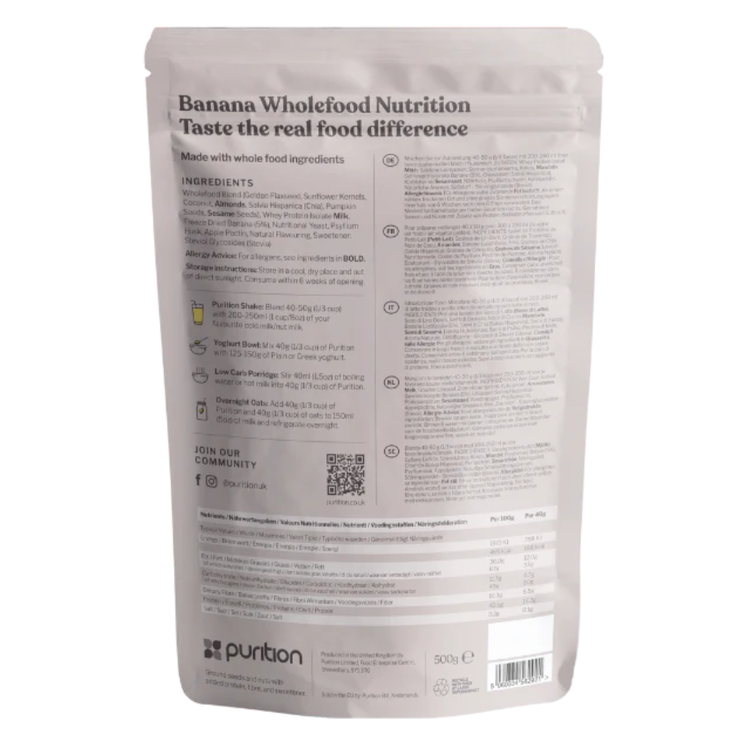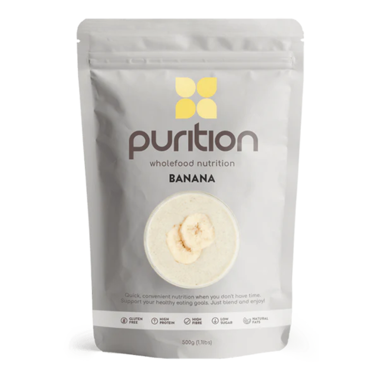 Purition Banana is blended from real wholefood ingredients golden flaxseed, sunflower kernels, chia, pumpkin seeds, sesame, coconut and almonds combined with whey protein isolate and real freeze dried banana for an authentic, subtly sweet taste. With a naturally creamy texture and slow release energy, it offers a nourishing alternative to ultra processed shakes and sugar heavy smoothies.