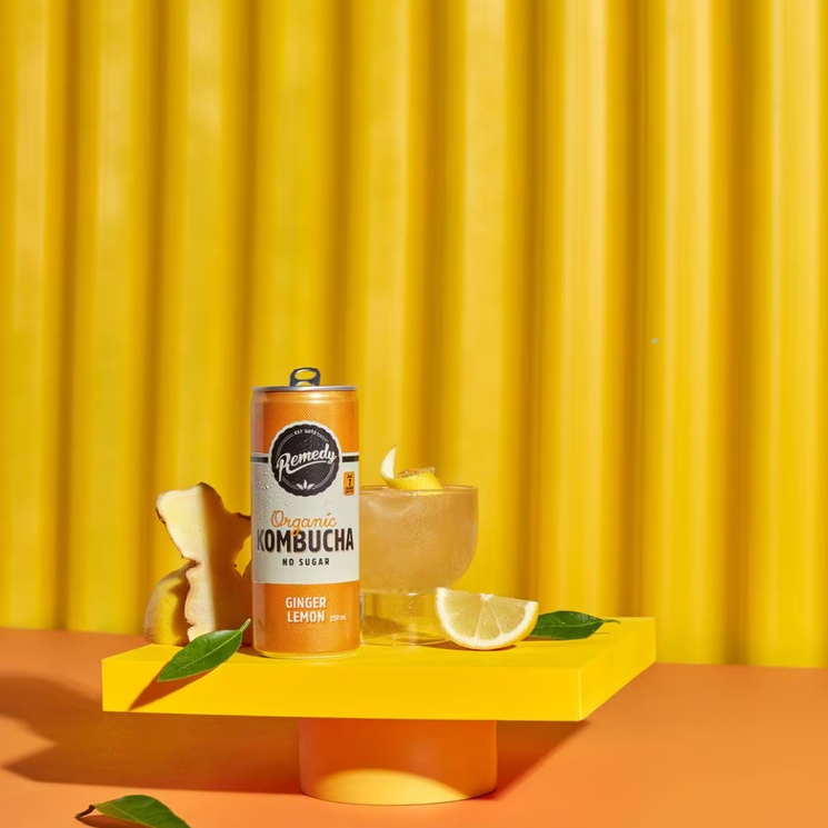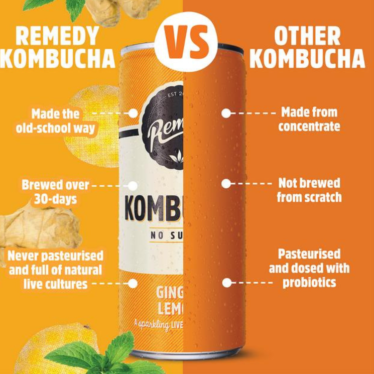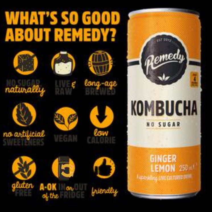 Ingredients: Raw kombucha (carbonated water, sugar*, black tea, green tea, traditional kombucha culture), ginger juice (2%), flavour enhancer: erythritol, lemon juice, sweetener: steviol glycosides (*No sugar remains after Remedy's traditional long-aged)