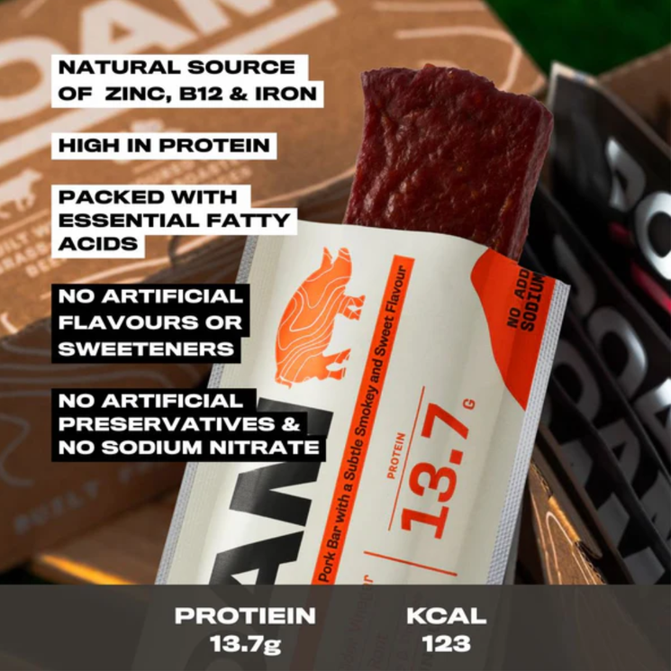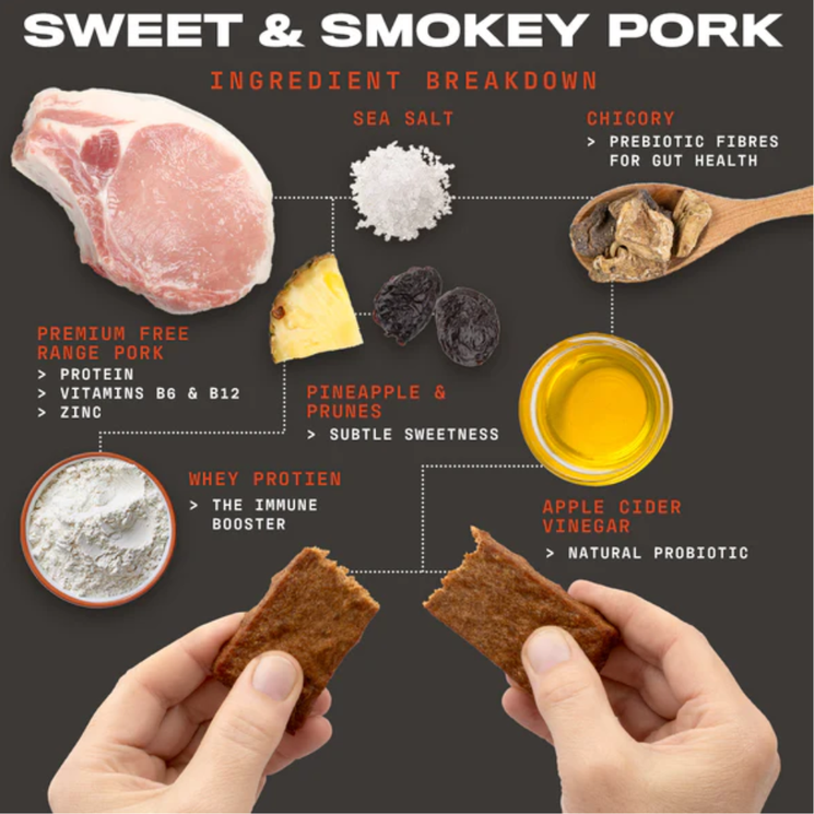 This Sweet & Smokey Free Range Pork Bar is crafted from premium free range pork and naturally smoked to bring out its deep, savoury richness. Blended with subtle notes of pineapple, prune and spices, it delivers a gentle sweetness that pairs beautifully with the smokiness. Designed as a nourishing, functional snack, it offers a satisfyingly firm bite and a wholesome, real food flavour.