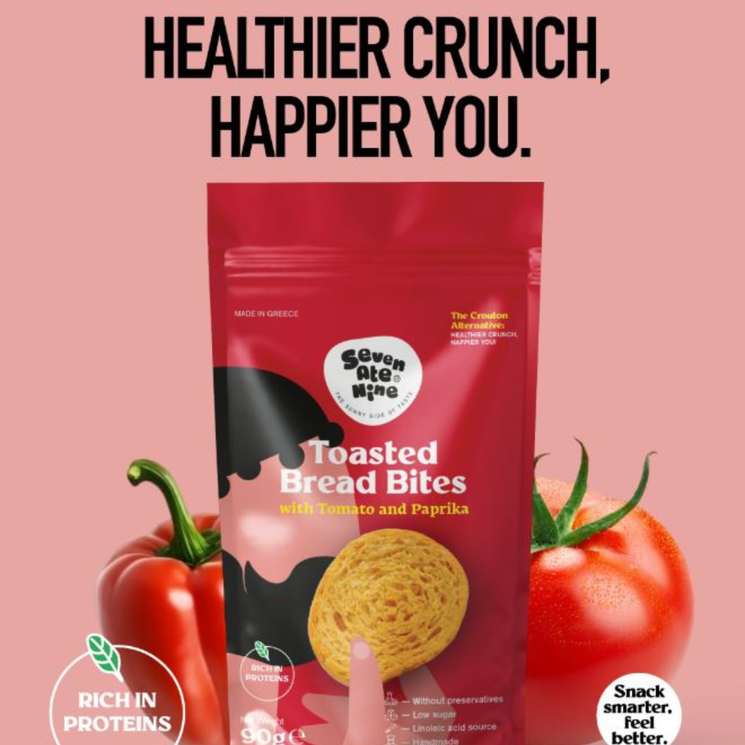 Seven Ate Nine Toasted Bread Bites Tomato & Paprika are crisp, savoury bites inspired by traditional Greek baking. Made with Cretan extra virgin olive oil, tomato paste and paprika, they offer a balanced flavour combining light sweetness from tomato with the gentle warmth of paprika. Handcrafted using simple ingredients, these toasted bread bites deliver a satisfying crunch and bold Mediterranean flavour. Enjoy them as a snack on their own, serve with dips, or add them to salads and soups as a crunchy alternative to croutons.