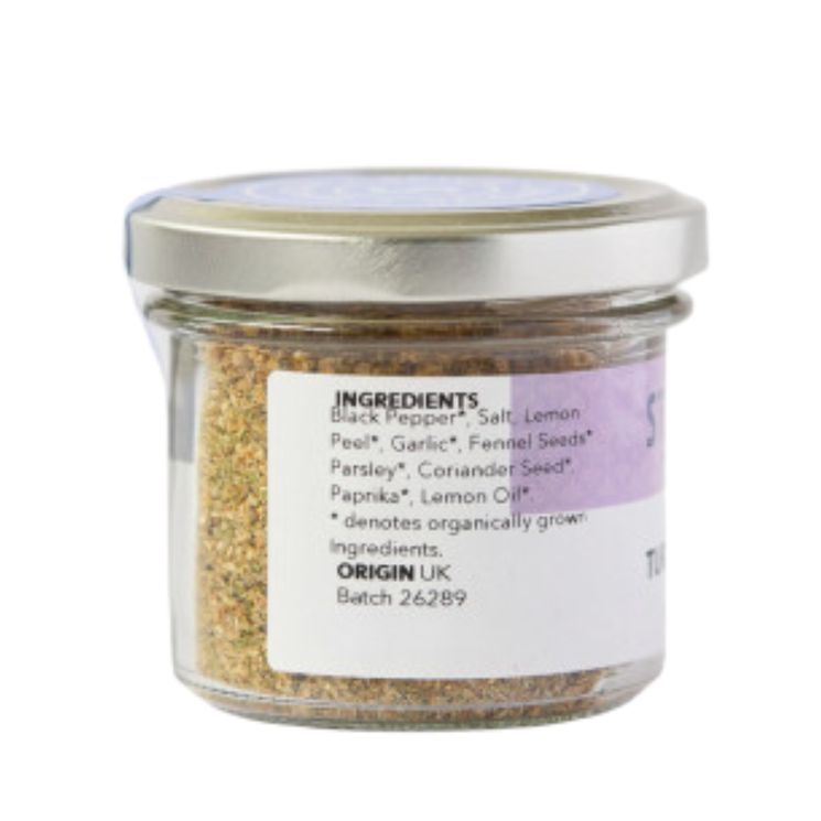 Organic black pepper, salt, lemon peel, garlic, fennel seeds, parsley, coriander seed, paprika, lemon oil.