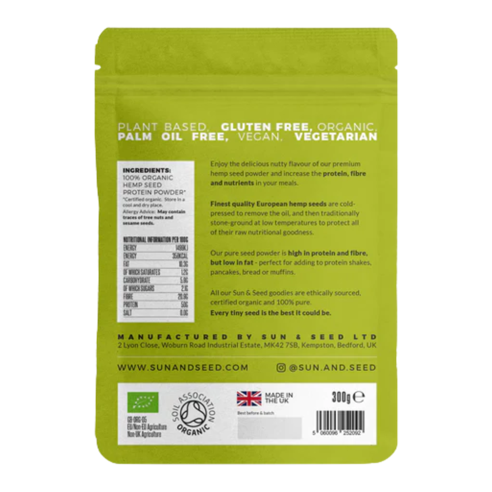 Sun and Seed Organic Raw Hemp Protein is a plant-based nutritional powerhouse made from the finest organically grown European hemp seeds. By carefully separating the oils from the seeds, this high protein, high fibre, and low fat powder is created without heat or chemicals.