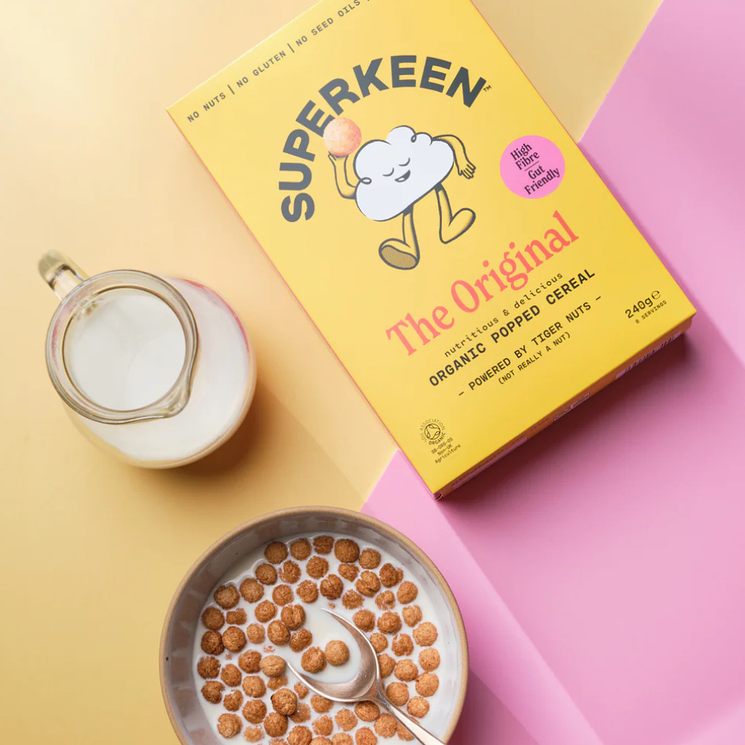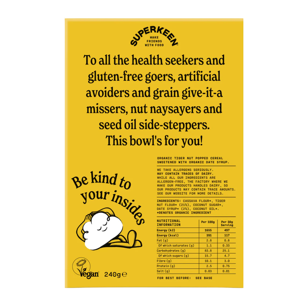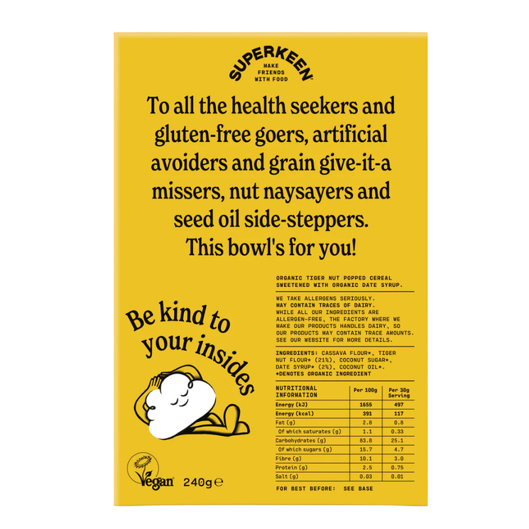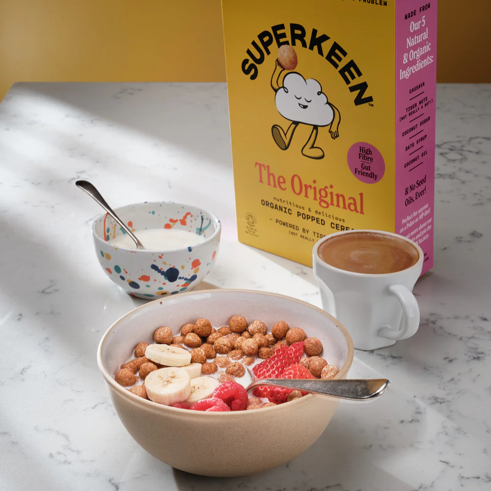 SUPERKEEN’s Original Tiger Nut Popped Cereal is a simple, feel good cereal crafted from organic cassava flour and naturally sweet tiger nut flour. Each puff is lightly coated with coconut oil, coconut sugar and a touch of date syrup, giving you a gentle sweetness without anything artificial. It’s wonderfully versatile pour over your favourite milk, scatter across yoghurt or smoothies, or grab a handful when you want a crunchy, clean snack.