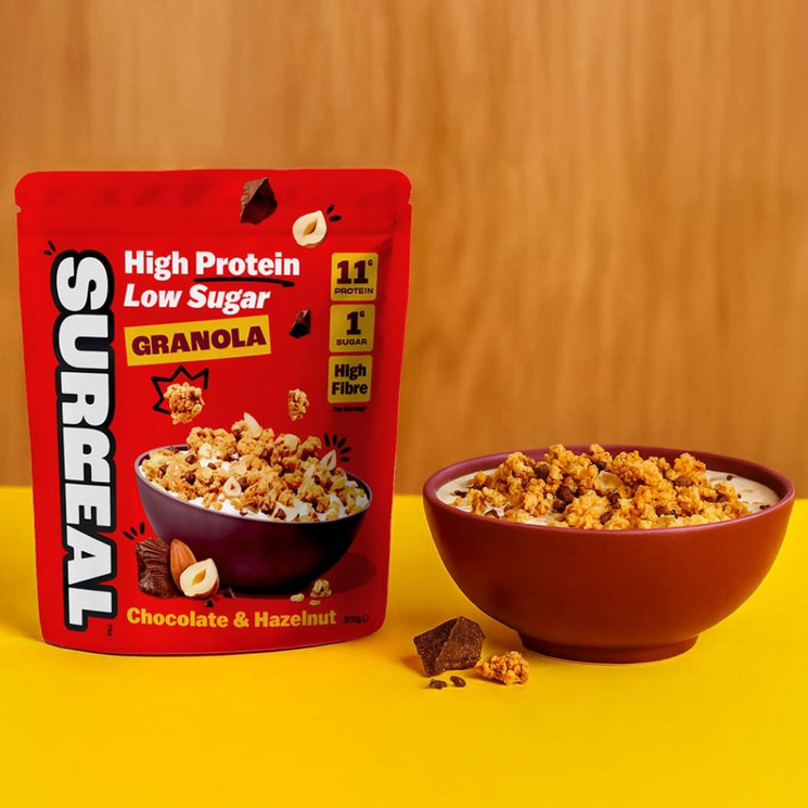 Surreal Chocolate Hazelnut Granola delivers the flavour of indulgence with the nutrition of a performance cereal. Packed with 14–15g of protein per 40g serving, high fibre, and absolutely no sugar, it’s crafted for those who want to fuel their day without compromise.