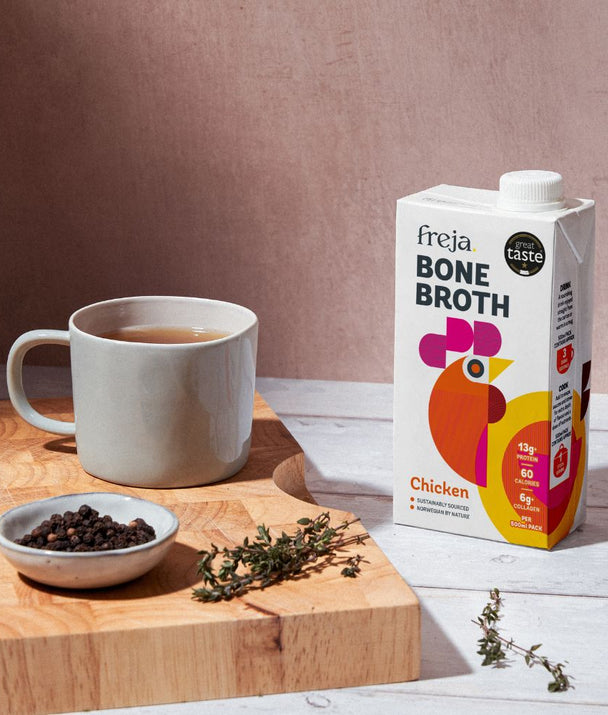 Freja Chicken Bone Broth is simmered low and slow to release rich flavour and key nutrients from responsibly sourced free-range chicken bones. Blended with aromatic herbs and vegetables, it’s a comforting, protein-rich broth ideal for enjoying on its own or as a wholesome cooking base.