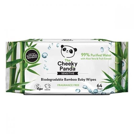 The Cheeky Panda bamboo wipes are whipped up from biodegradable bamboo (instead of non-biodegradable, ocean-polluting polyester). Panda's wipes are proudly vegan and never (ever) tested on animals. These cheeky wipes are completely natural, Panda's wipes are wonderful for babies - made from 99% water, 1% aloe juice and fruit extract, and a teeny weeny trace of food preservative (for squeeky clean anti-bacterial qualities).