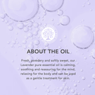 Lavender essential oil has a long history in aromatherapy, renowned for its deeply soothing and restorative qualities. Its relaxing aroma helps ease anxious feelings, quieten the mind and support more restful sleep. When applied in a properly diluted blend, Lavender is also known for its skin soothing benefits, helping to calm minor irritation and nourish dry skin.