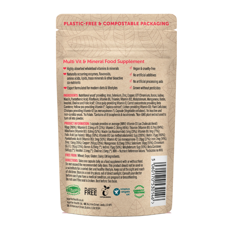 With key nutrients provided in their food identical forms, such as Vitamin C from citrus, beta carotene from carrot, Vitamin E from yellow pea, Vitamin K2 from fermented chickpeas and natural folate from spinach, this multi offers complete daily nourishment aligned with the needs of modern diets.