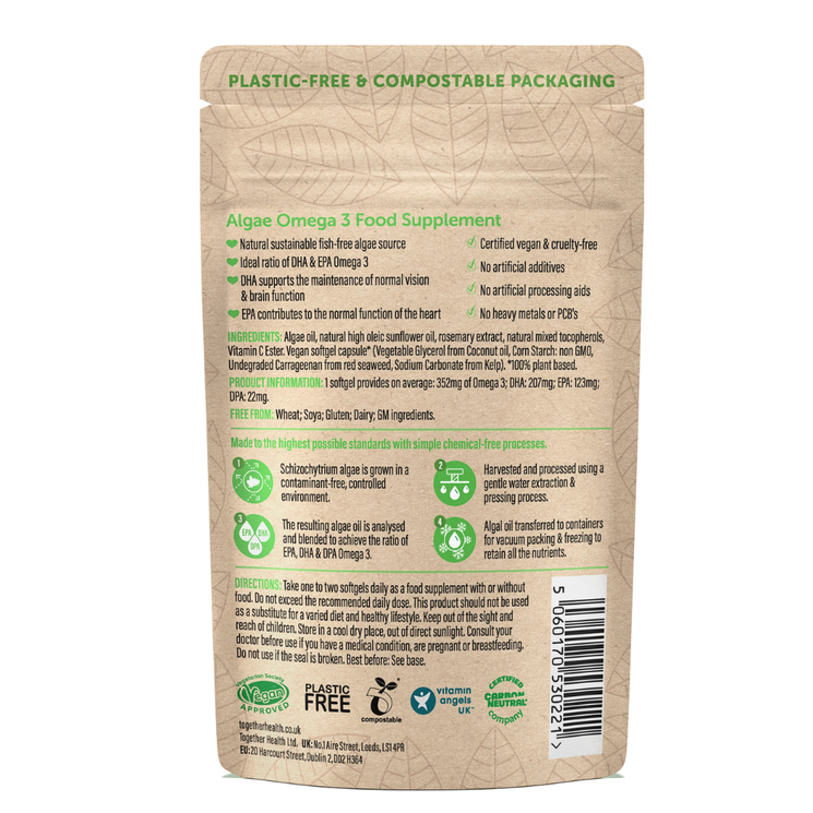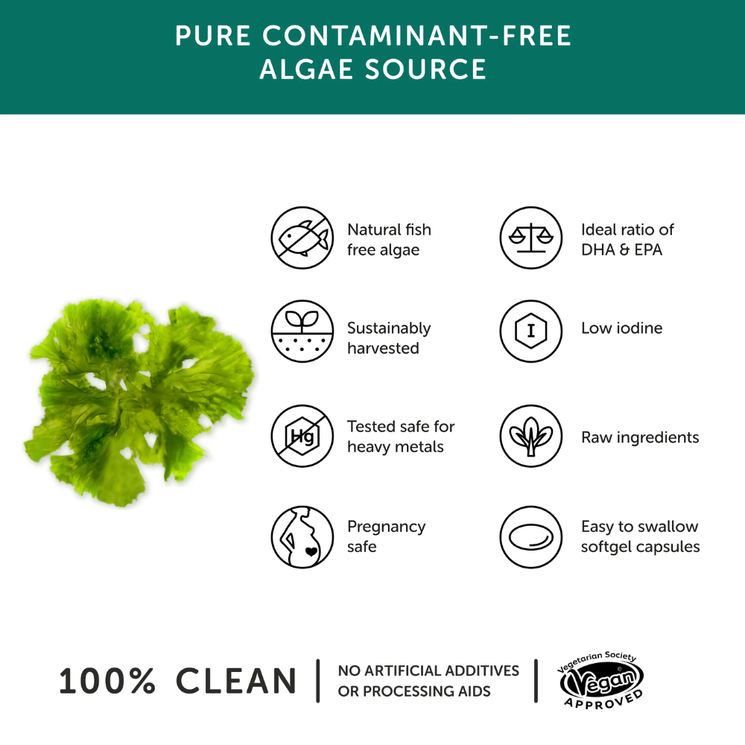 This algae derived Omega 3 offers a direct, vegan source of DHA and EPA the same essential fatty acids found in fish, but without the environmental impact or risk of ocean contaminants. Grown in a controlled, land-based environment, the algae provides a pure and highly bioavailable source of Omega 3, free from heavy metals, PCBs and other marine pollutants.