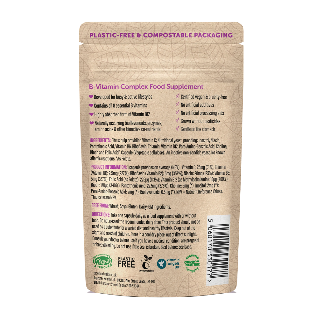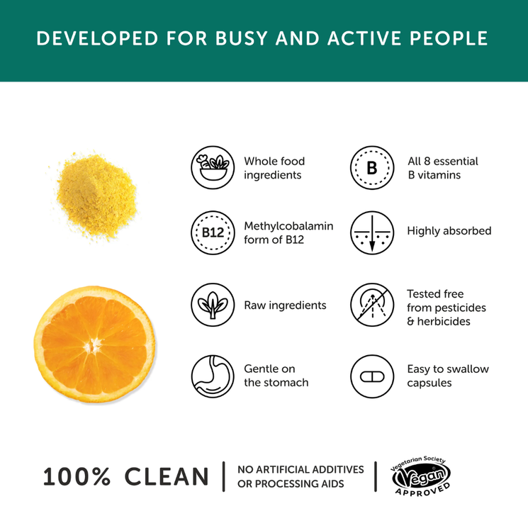 This advanced whole food B-complex is made using raw, minimally processed ingredients including nutritional yeast and whole citrus pulp. Using low heat methods preserves naturally occurring cofactors such as enzymes, phytonutrients, amino acids and trace minerals allowing the body to recognise and absorb the nutrients more efficiently.
