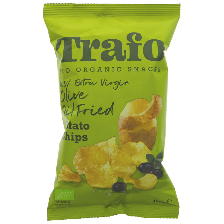 Trafo Organic Potato Chips fried in Virgin Olive Oil. The delicious crisps are lightly salted and fried in extra virgin olive oil. The process with a maximum temperature of 165 °C is longer and slower than with regular chips, which gives them more bite.