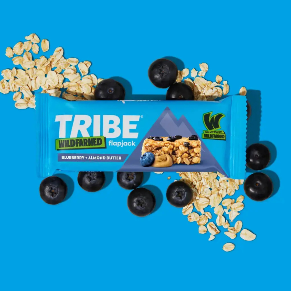 TRIBE Wildfarmed Blueberry + Almond Butter Flapjacks are made with regeneratively farmed oats and real, wholesome ingredients. With raisins, dates, almonds, and freeze dried blueberries, these flapjacks are naturally sweetened and combined with almond butter for a rich, nutty flavour.