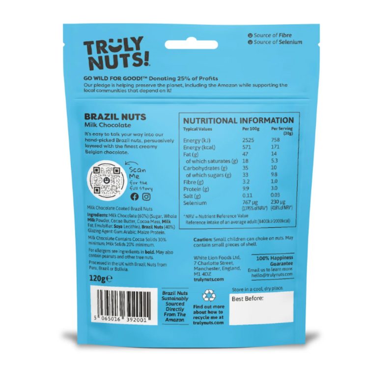 Made with high quality milk chocolate and whole Brazil nuts, this snack is rich in nutrients as well as flavour. Brazil nuts are one of the best natural sources of selenium, essential for immunity and thyroid function. With added protein and fibre, these chocolate-coated nuts offer both indulgence and nutrition in every bite.