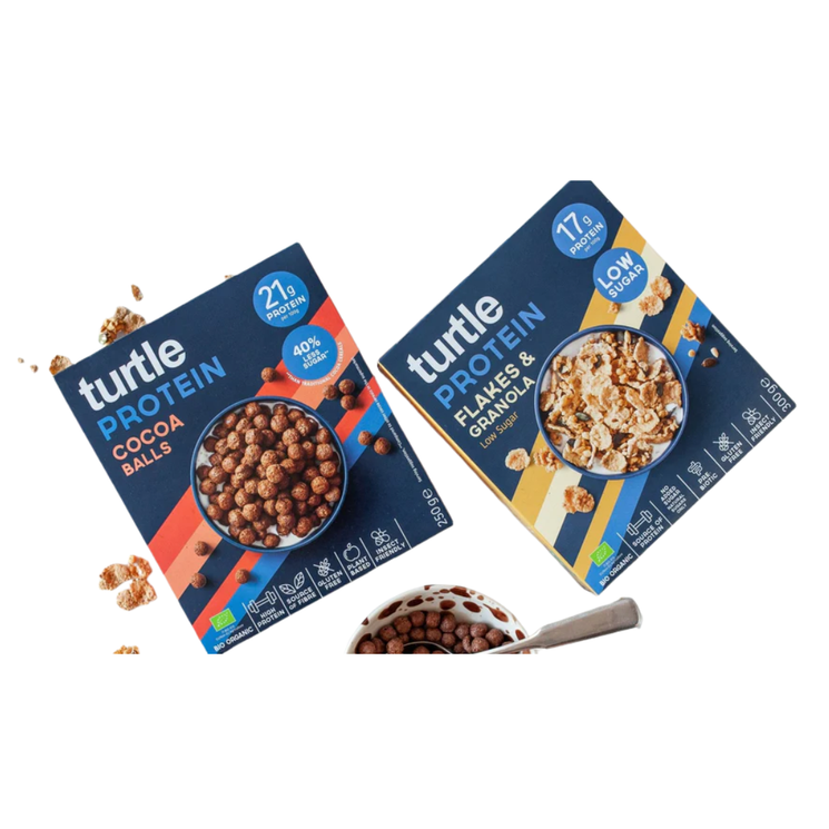 Turtle High Protein Cocoa Balls are crunchy organic chocolate cereal balls designed for a nourishing start to the day. Made with organic corn flour, pea protein and cocoa powder, they deliver a rich chocolate flavour alongside a satisfying crisp texture. With 21g of plant-based protein per 100g and 40% less sugar than traditional cocoa cereals, this cereal offers a balanced option for breakfast or snacking. Enjoy with milk or a plant based alternative, add to yoghurt bowls, or snack on them straight from the bowl for a chocolatey crunch.