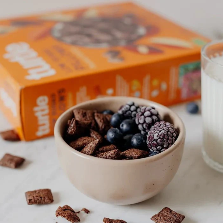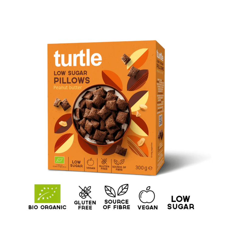 Turtle Organic Peanut Butter Pillows combine a crisp cereal shell with a creamy peanut butter centre for a naturally satisfying bite. Made with organic peanut butter (35%), wholegrain gluten free oat flour and cocoa powder, these pillows balance nutty richness with chocolatey depth. With low sugar and a source of fibre and plant based protein, they bring a feel good twist to classic peanut butter cereal.