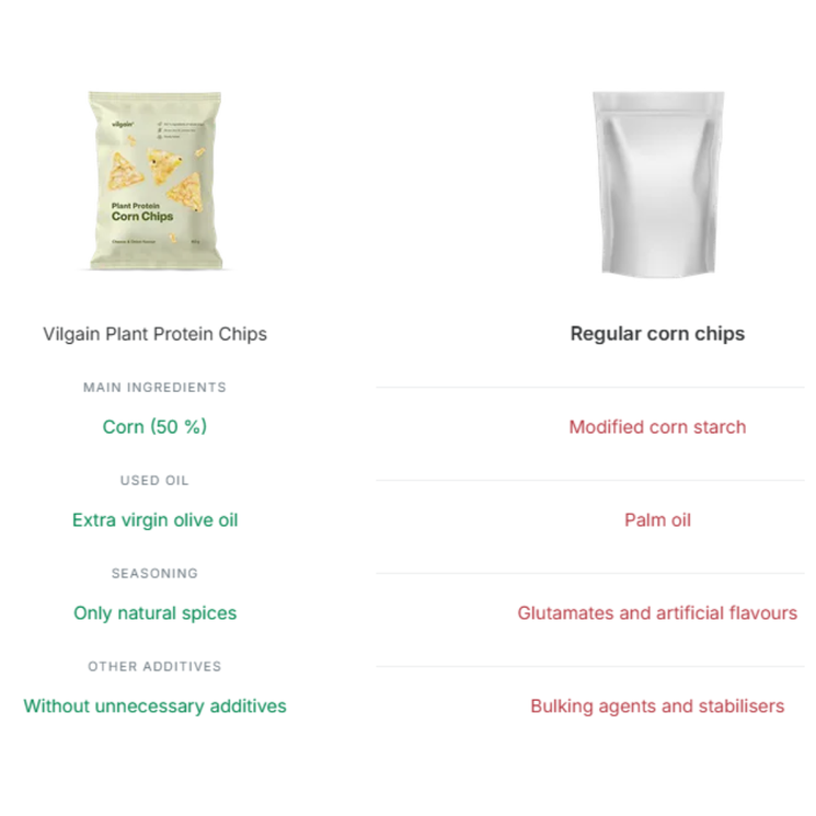 Vilgain Organic Protein Corn Chips BBQ are crunchy, slow roasted vegetable chips made with care and proper ingredients. Using organic corn as the base and roasted gently at low temperatures in extra virgin olive oil, they’re designed to preserve flavour and nutritional value. Seasoned with a rich BBQ blend and boosted with plant based protein from peas, rice and lentils, these chips offer a satisfying, savoury snack that’s light yet filling. A great choice for relaxed snacking without refined oils or unnecessary additives.