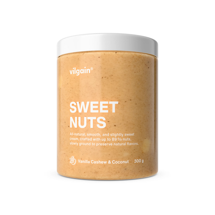 Vilgain Sweet Nuts Vanilla Cashew & Coconut is a delicately sweet and creamy nut butter made from 61.8% cashews and 28% coconut. The nuts are freshly processed in Vilgain’s own production facility using gentle methods that enhance flavour while maintaining their natural nutritional profile. A touch of organic coconut sugar and real ground vanilla adds a warm, fragrant sweetness that complements the rich nuttiness of the blend. With its smooth texture and naturally indulgent taste, this spread works beautifully on toast, porridge and pancakes, or whisked into yoghurt, smoothies and desserts. It delivers satisfying healthy fats and plant protein with a simple, clean ingredient list.