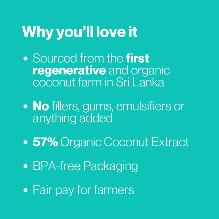 Our Regenerative Organic Coconut Milk is free from gums, fillers, preservatives, and added sugar. The tin is also BPA-free. It's the absolute most natural coconut milk available in the UK, providing a clean and healthy option for all your cooking and baking needs. Enjoy the benefits of pure, unadulterated coconut milk in so many of your favourite dishes.